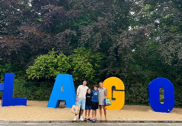 Onze nieuwe, Beire-grote LAGO letters staan te schitteren aan het zwembad.