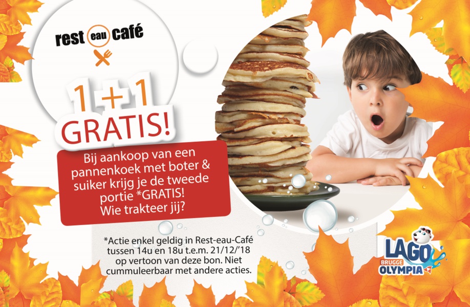 Deze actie is elke dag tussen 14u en 18u geldig tot en met 21 december 2018 en enkel in Rest-eau-Café bij bestelling van een pannenkoek met boter en suiker.