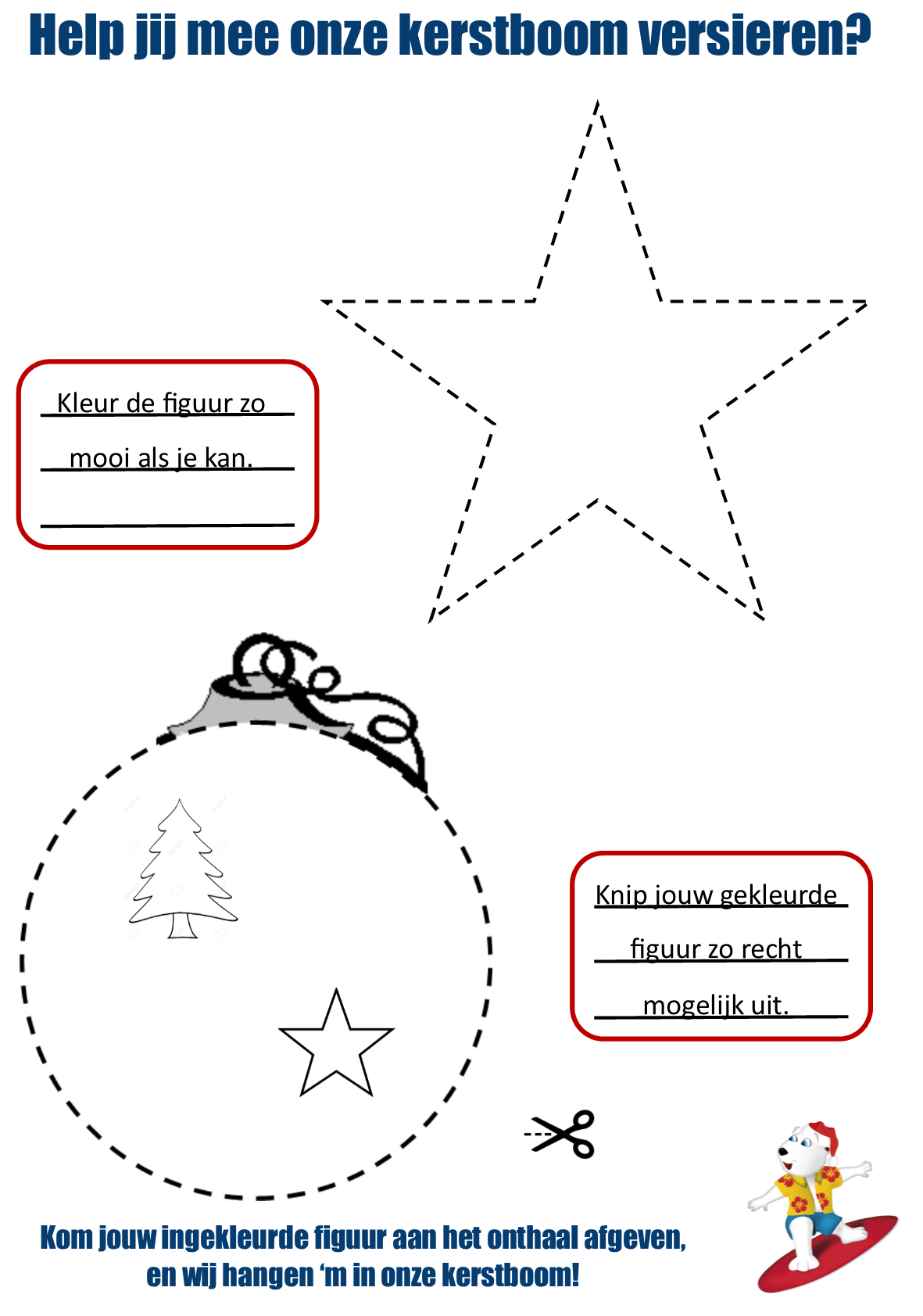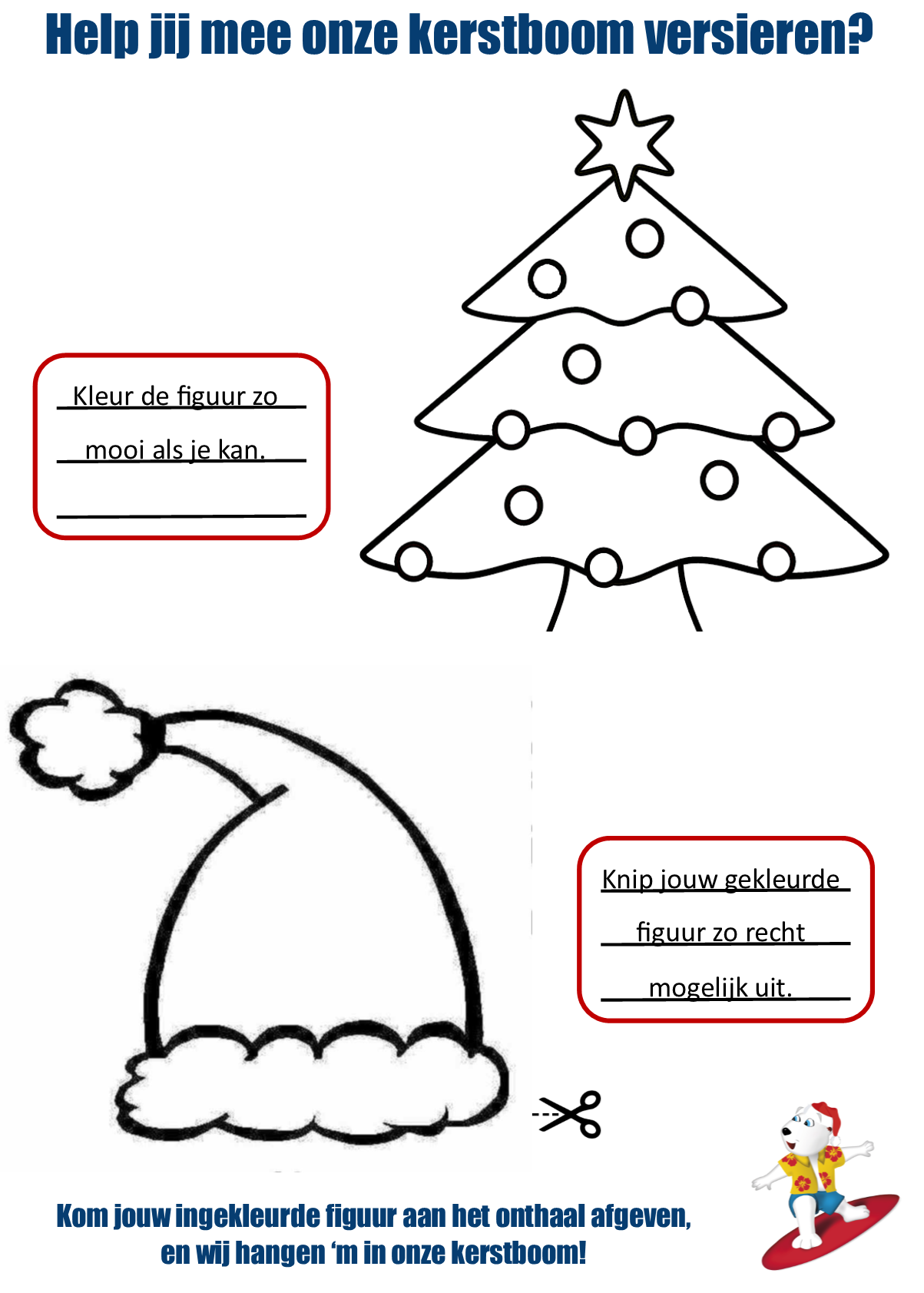 Geef onderstaande figuurtjes uitgeknipt en ingekleurd af aan het onthaal en zorg zo samen met ons voor de kleurrijkste kerstboom die ooit in ons onthaal stond.