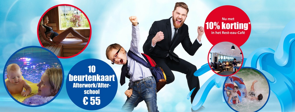 Heb je een Afterworkpas of een Afterschoolpas? Top! Als je er nu tien nieuwe beurten bij zet doen wij je een bon cadeau waarmee je 10% korting* krijgt in ons Rest-eau-Café.