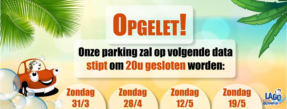 OPGELET: op zondag 31 maart, zondag 28 april, zondag 12 mei en zondag 19 mei sluit onze parking om 20u.