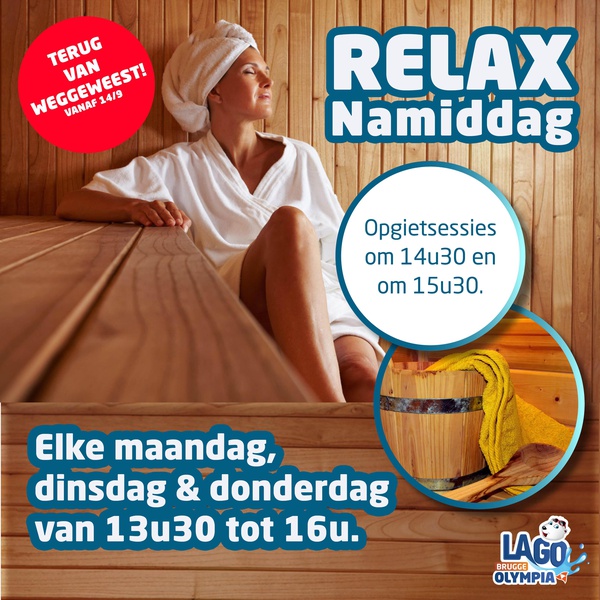 *Er is geen Relax Namiddag op feestdagen. Omwille van Covid-19 is de stoomhut gesloten en zijn de jacuzzi functies niet actief. Opgelet: er is plaats voor max. 15 personen in de sauna.