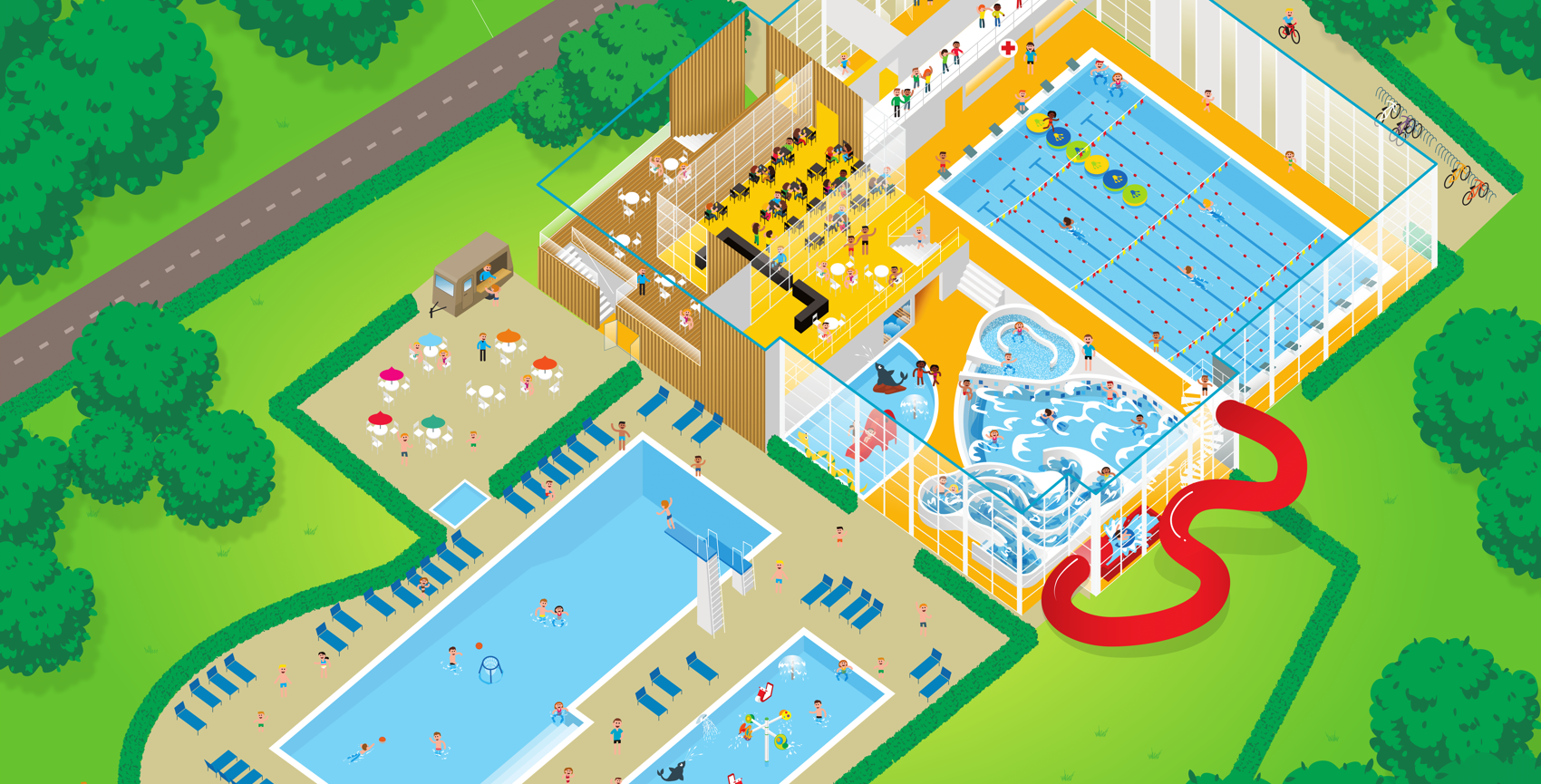 Nehmen Sie die ganze Familie mit, für viel Wasserspaß im Kinderbecken, der Wildwasserbahn, dem Wellenbecken, Freibecken, dem Freibecken, der warmen Lagune, dem Dampfbad und dem Sportbecken. Um sich zwischendurch zu erholen können Sie ein vorzügliches Menü auf der Schwimmerterrasse genießen!