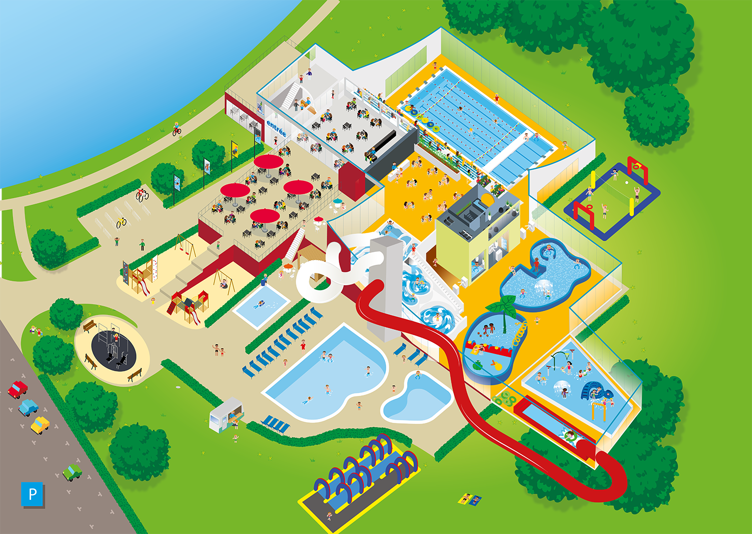 Dévalez les toboggans, plongez dans les tourbillons de la rivière rapide, barbotez dans la pataugeoire avec les tout-petits, nagez dans la piscine extérieure ou détendez-vous à la lagune d’eau chaude !